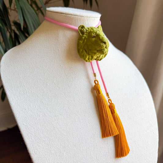 Lion/Tiger Bolo Olive Green with Bubblegum Pink & Golden Yellow Necklace