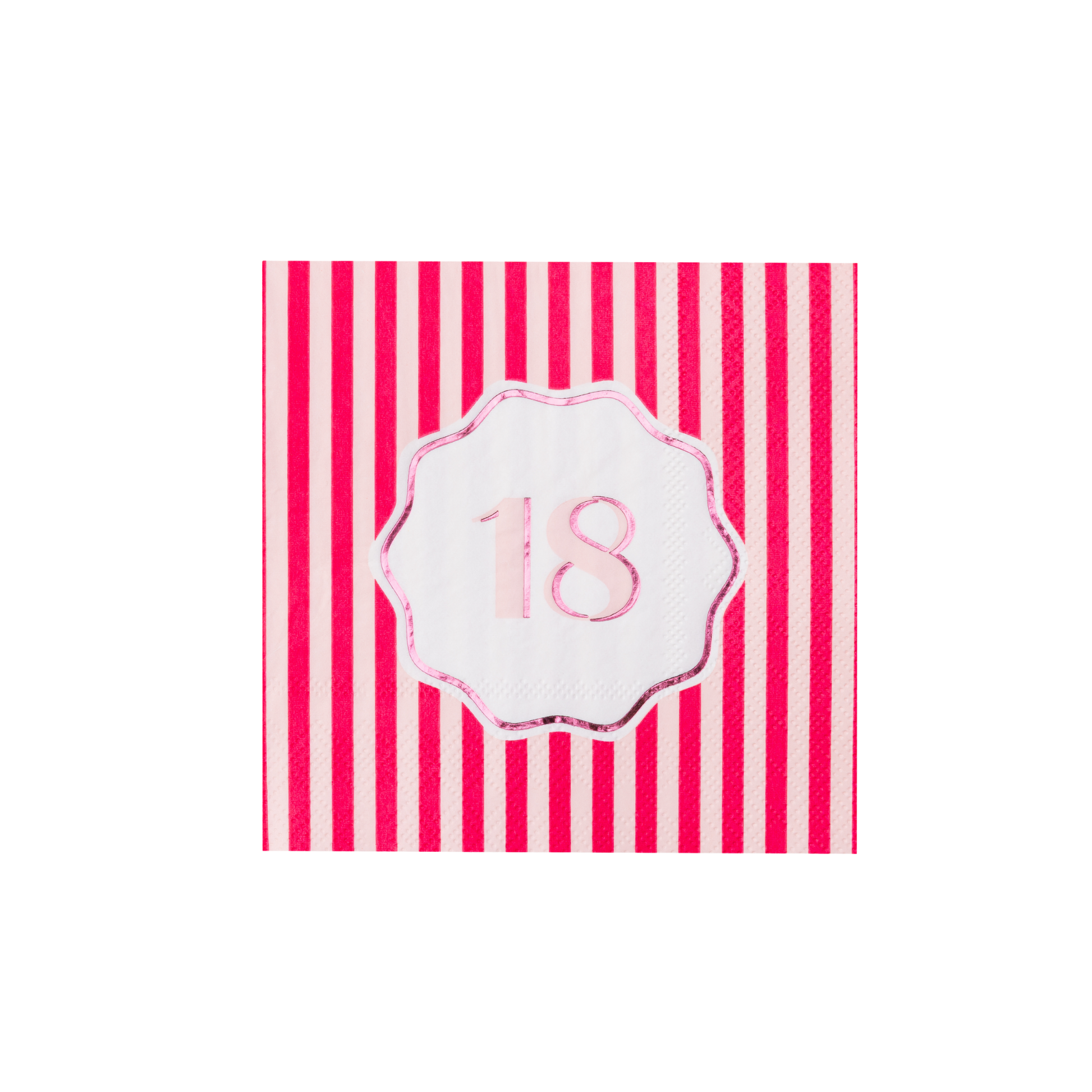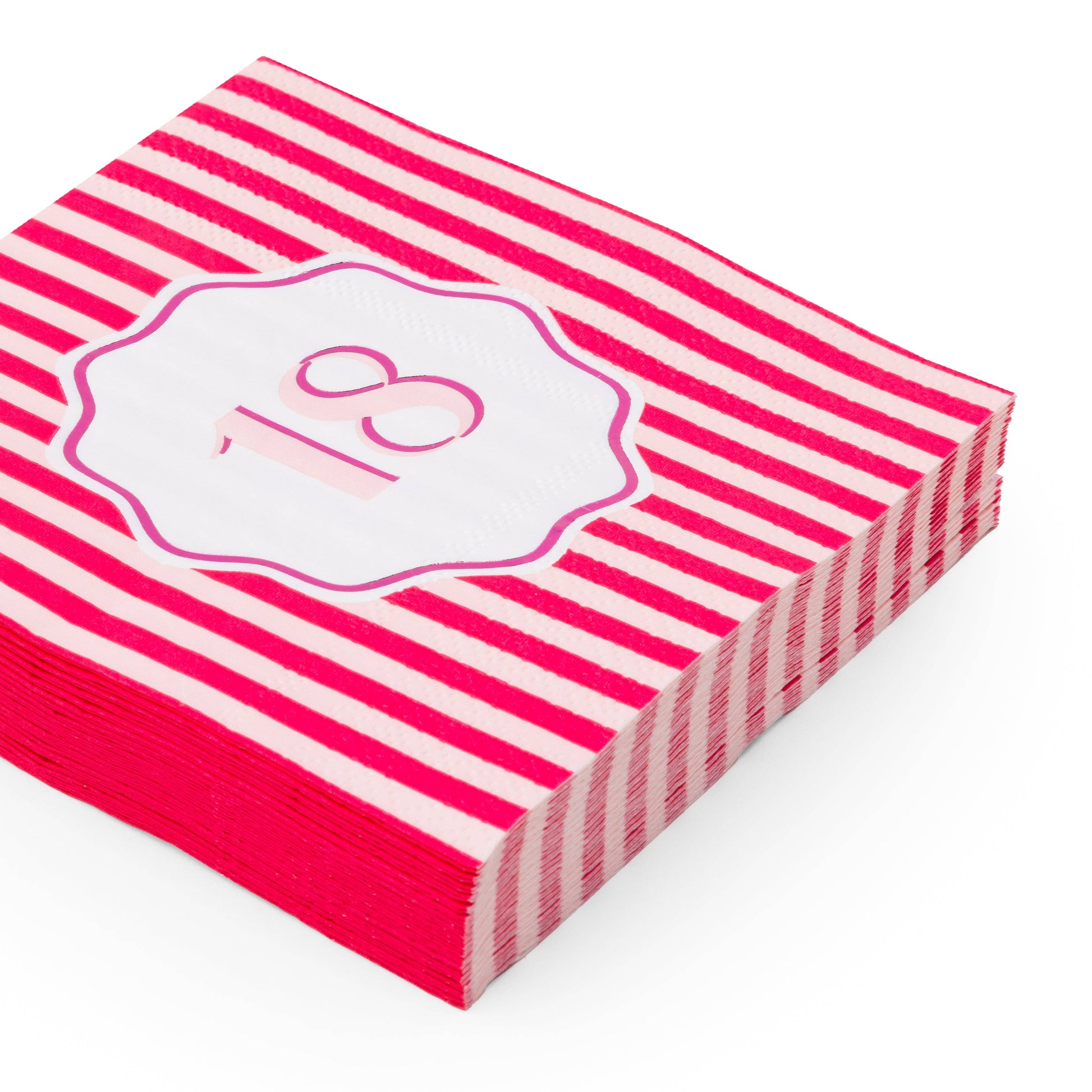 18th birthday cocktail napkins featuring vibrant hot pink stripes on a pastel pink base. Perfect for milestone celebrations and party toasts, with coordinating small plates available for a playful yet polished tablescape.