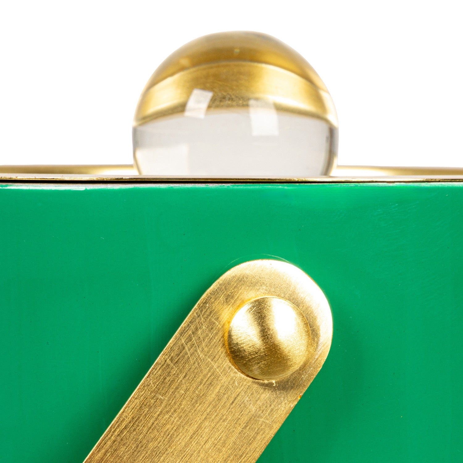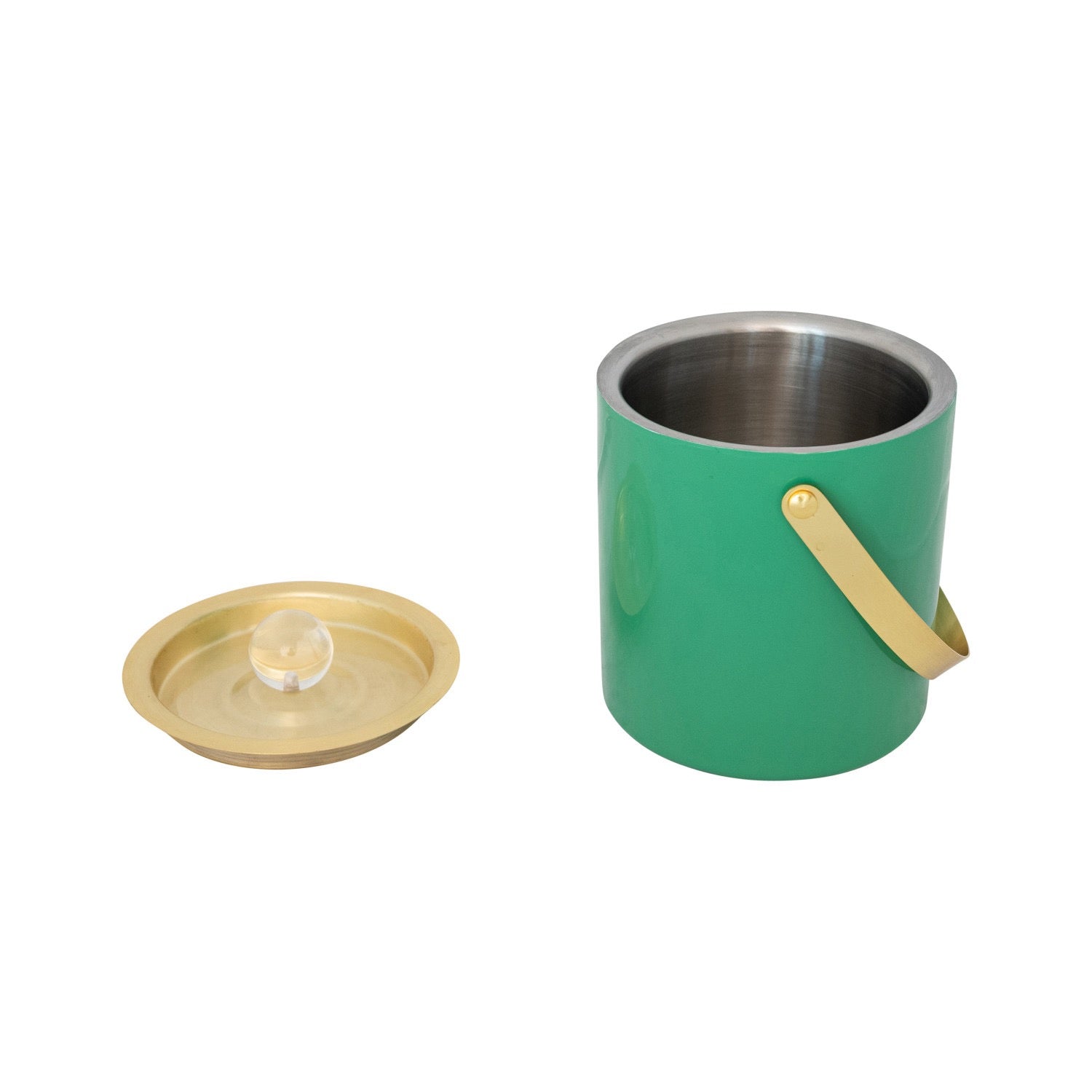 6" Round x 7-1/4"H 1-1/2 Quart Enameled Stainless Steel Ice Bucket w/ Lid & Glass Knob, Gold Finish & Turquoise Color