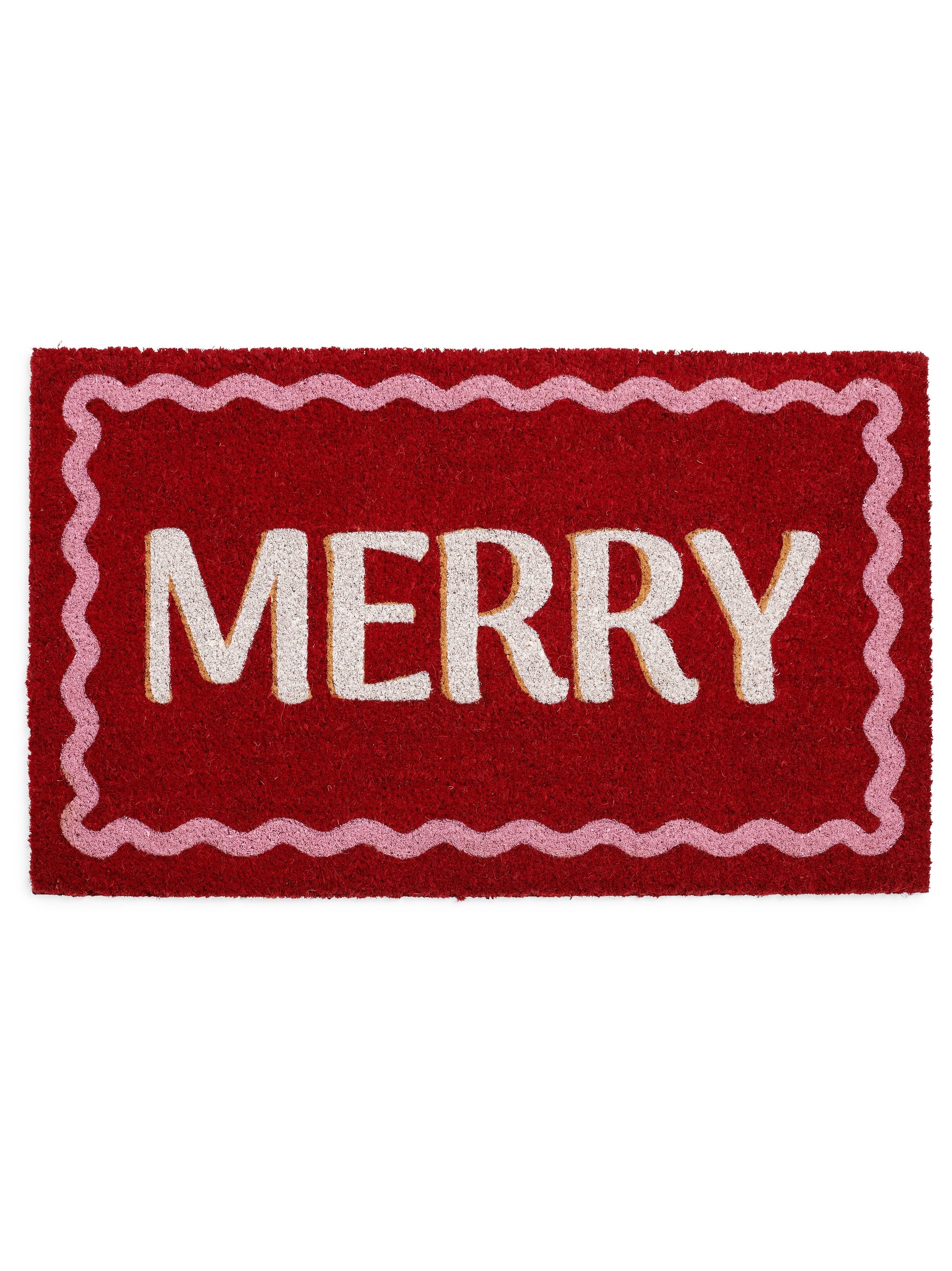Make spirits bright right from the doorstep with the “M-E-R-R-Y” Doormat! This festive mat features bold ivory lettering on a cheerful red background, framed by a playful pink squiggle border that adds a pop of personality. Made from durable coir fiber, it’s designed to keep shoes clean and bring a little holiday magic to your entryway. Whether you're welcoming guests or just dashing through the door, this mat sets the tone for a joyful season.