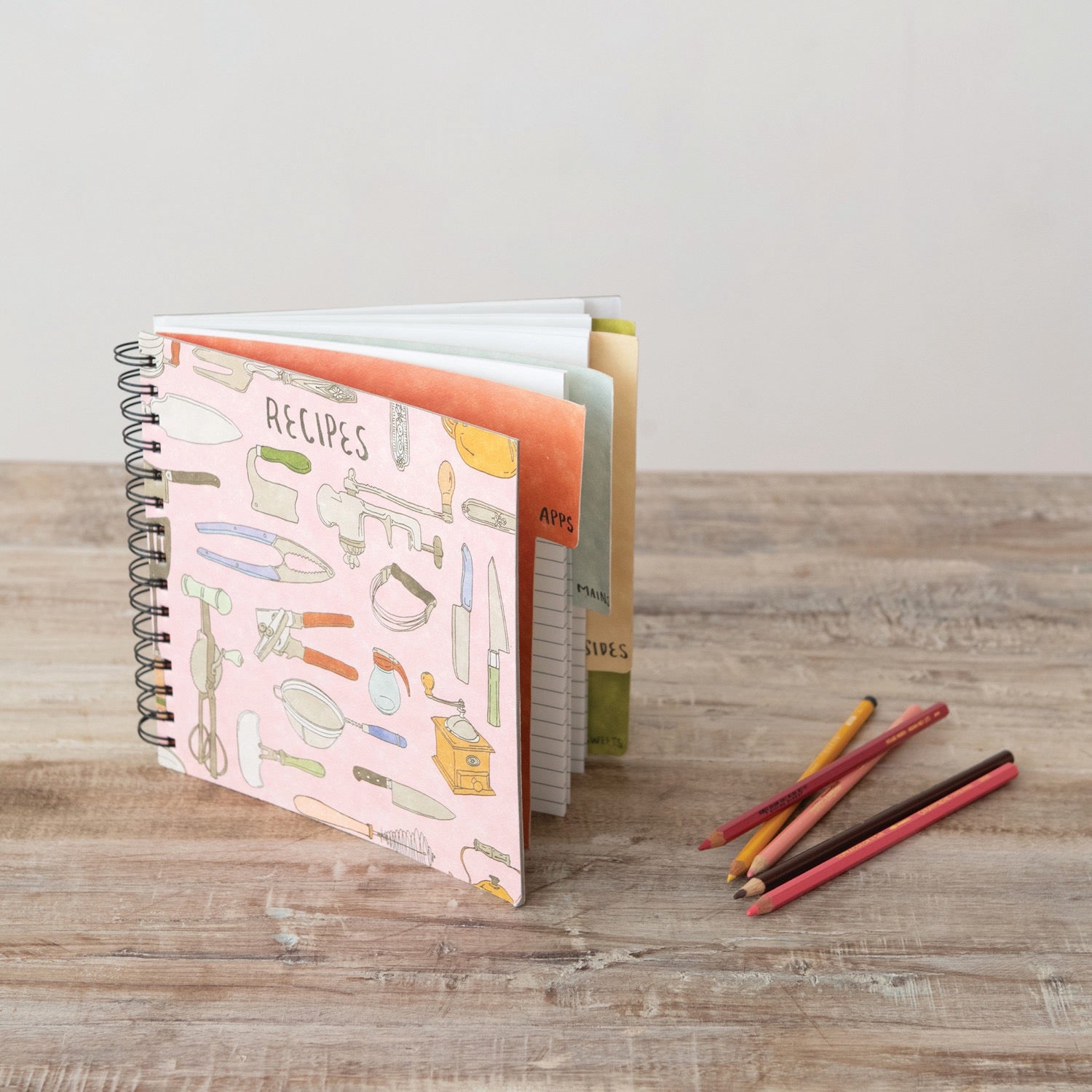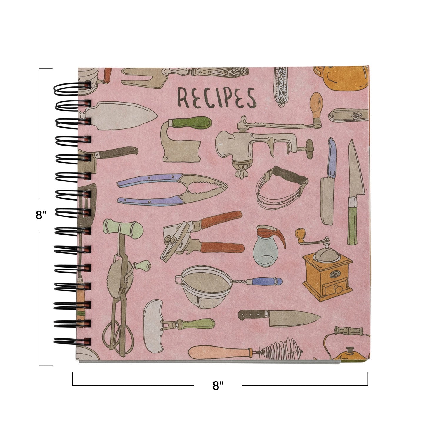 8" Square Spiral Bound Paper Recipes Journal w/ Kitchen Utensils/Tools Pattern, Multi Color