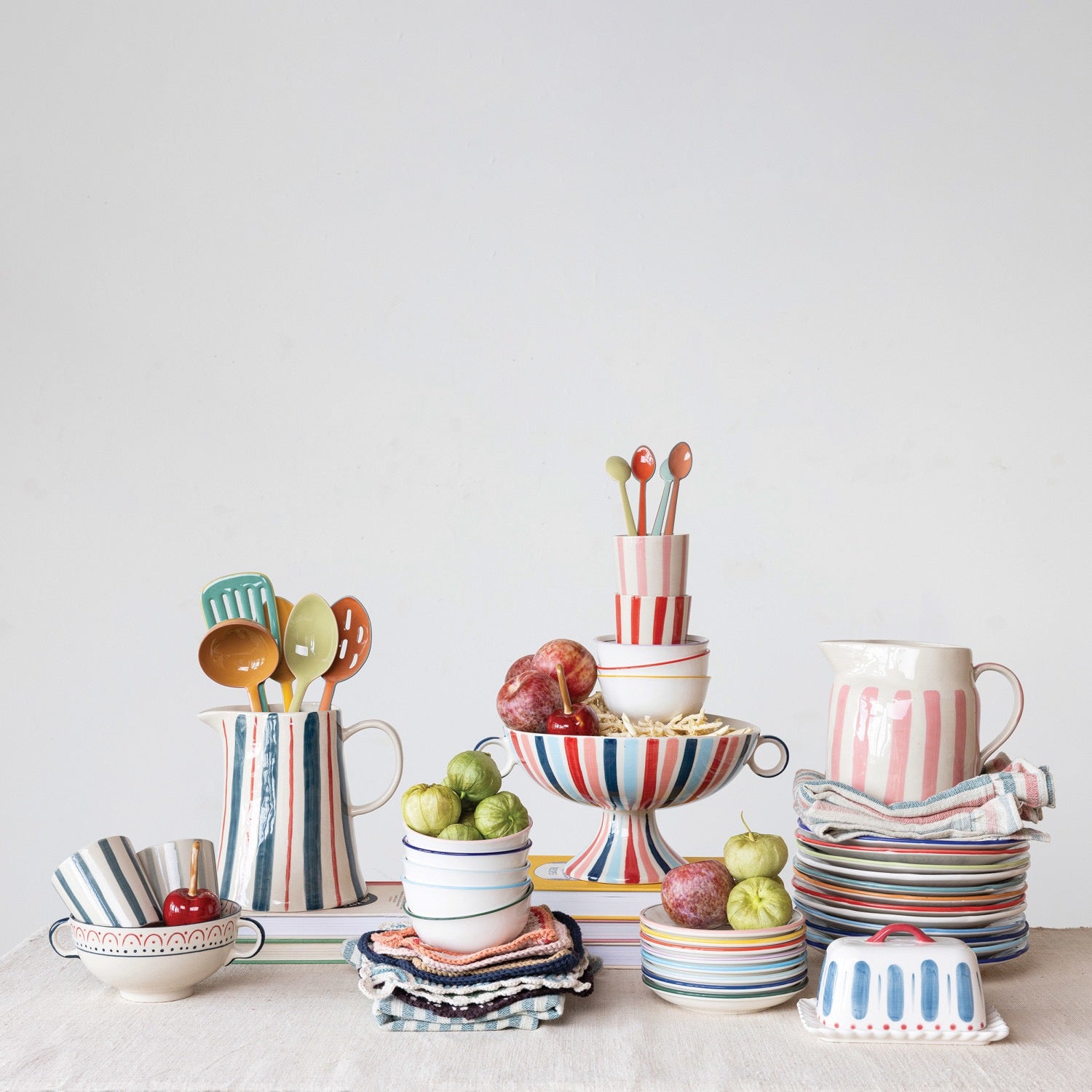 8-1/4"L x 6"W x 3-1/4"H Stoneware Bowl w/ Handles & Pattern, Blue, Red & White
