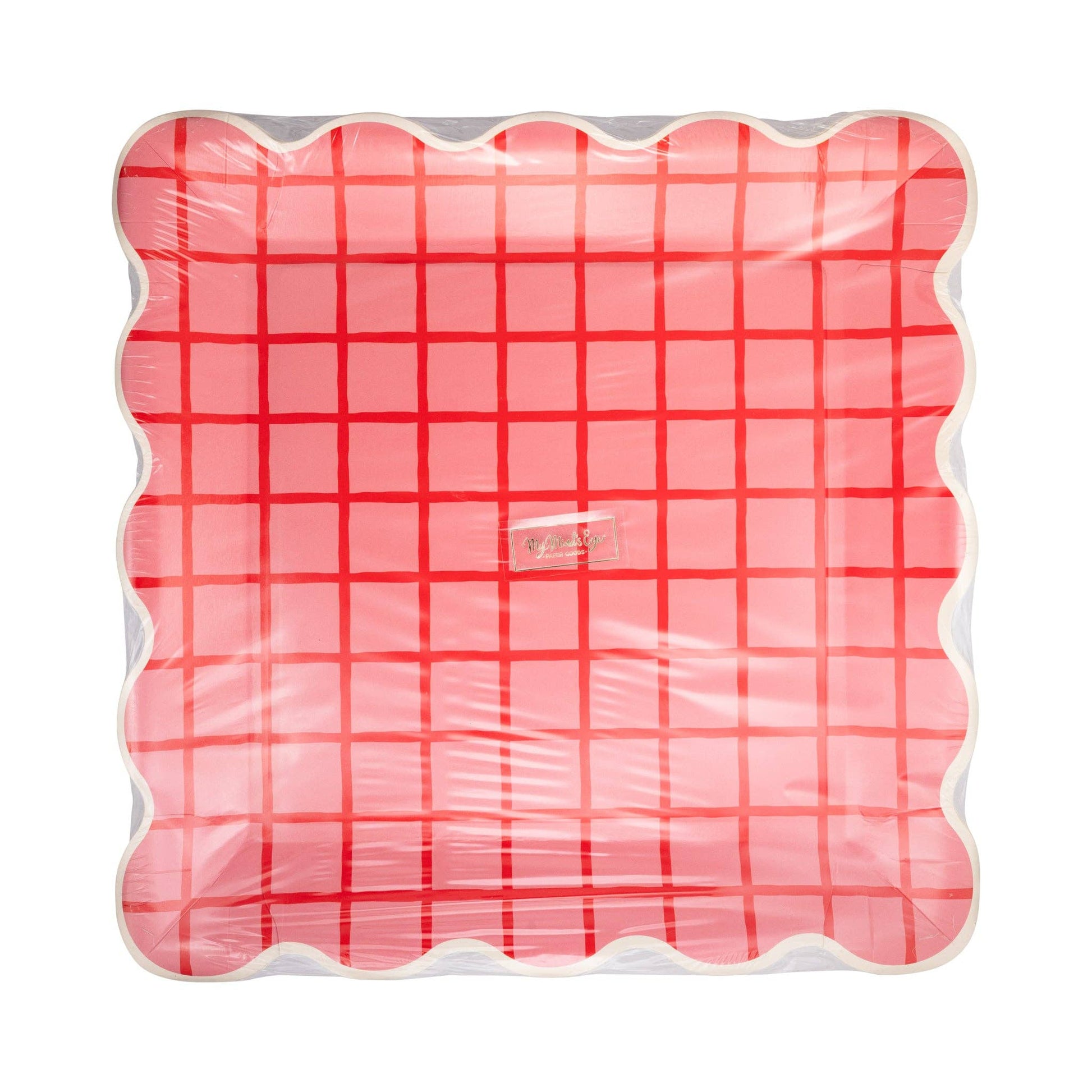 Add a splash of color to your party with the Red and Pink Grid Scallop Square Plate. Featuring a cheerful grid design in red and pink hues and charming scalloped edges, these plates bring a coordinated and festive vibe to your table. Perfect for serving snacks, desserts, or appetizers, they help create a lively atmosphere for any celebration. • includes 8 shaped paper plates • 10" x 10" inches